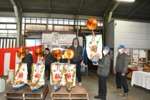 【えちご上越】上越市の新印上越青果は5日、恒例の新春初市式を開いた。買参人や生産者ら約50人が参加し、商売繁盛を祈願。果物や野菜を盛った宝船5艘(そう)や、新鮮な農産物が次々とせり落とされた。