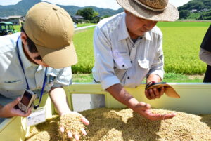 写真説明=刈り取った米を確認する川村代表(右)(新潟県村上市で)